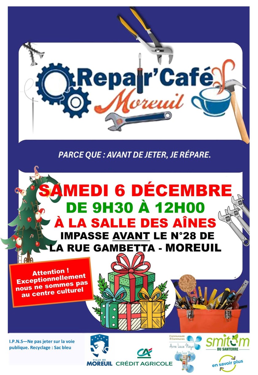 venez boire un café et faire réparer votre petit électroménager, vos outils ... parce que avant de jeter, je répare. Repair'Café le samedi 6 décembre de 10h à 12h au centre culturel 2 rue gambetta Moreuil ( en face de l'église) Pour plus d'informations : repair80110@orange.fr