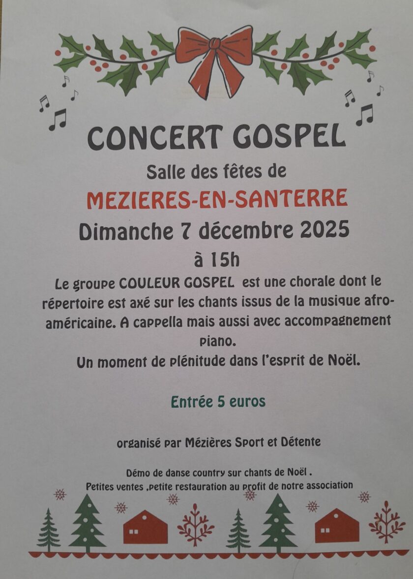 l'Association Mézières Sport et Détente vous propose un concert assuré par le groupe COULEUR GOSPEL le dimanche 7 décembre à 15h00 dans la salle des fêtes de Mézières en Santerre afin d'entrer dans l'esprit de Noël et partager un moment convivial. entrée 5€ sans inscription