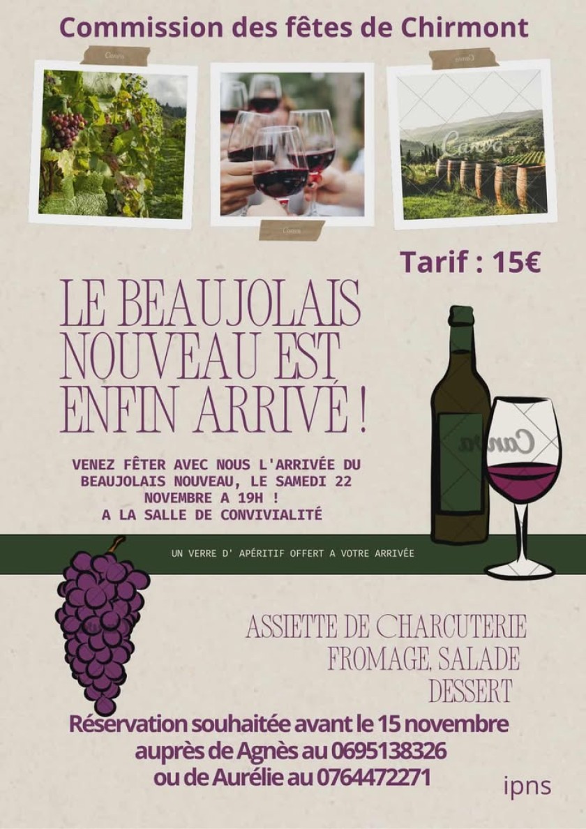la Commission des fêtes de Chirmont vous propose une soirée Beaujolais nouveau le samedi 22 novembre à partir de 19h dans la salle de convivialité de Chirmont un verre d'apéritif offert à votre arrivée tarif 15€ assiette de charcuterie / fromage / salede et dessert réservation avant le 15 novembre auprès d'Agnes au 06 95 […]