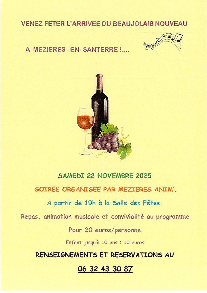 Mézières Anim vous propose une soirée Beaujolais nouveau le samedi 22 novembre à partir de 19h dans la salle des fêtes de Mézières en Santerre repas, animation musicale et convivialité au programme. pour 20€ / personne enfant jusque 10 ans / 10€ réservations au 06 32 43 30 87 l'abus d'alcool est dangereux pour santé, […]
