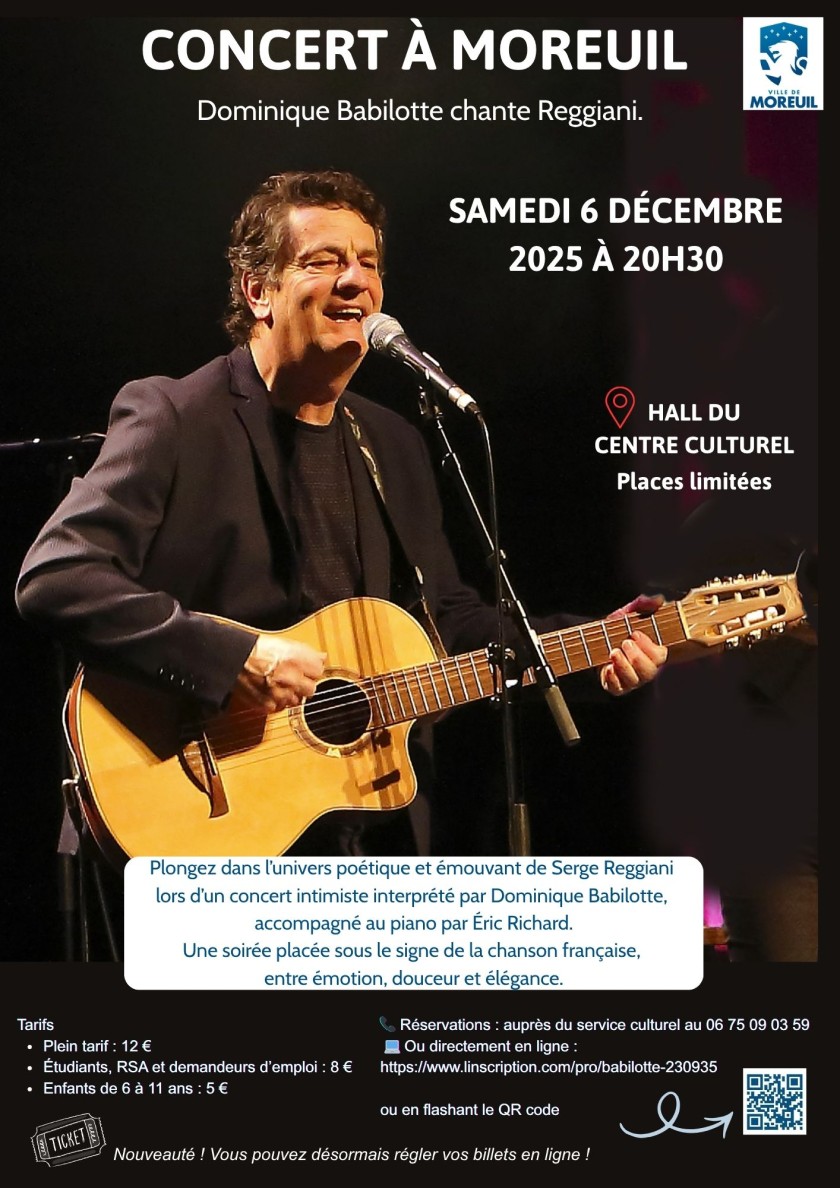 Concert : Dominique Babilotte chante Reggiani le samedi 6 décembre à 20h30 dans la Hall du Centre Culturel à Moreuil places limitées tarifs : plein tarif 12€ tarif réduit 8e enfants de 6 à 11 ans 5€ réservations au 06 75 09 03 59 ou https://www.linscription.com/pro/babilotte-230935