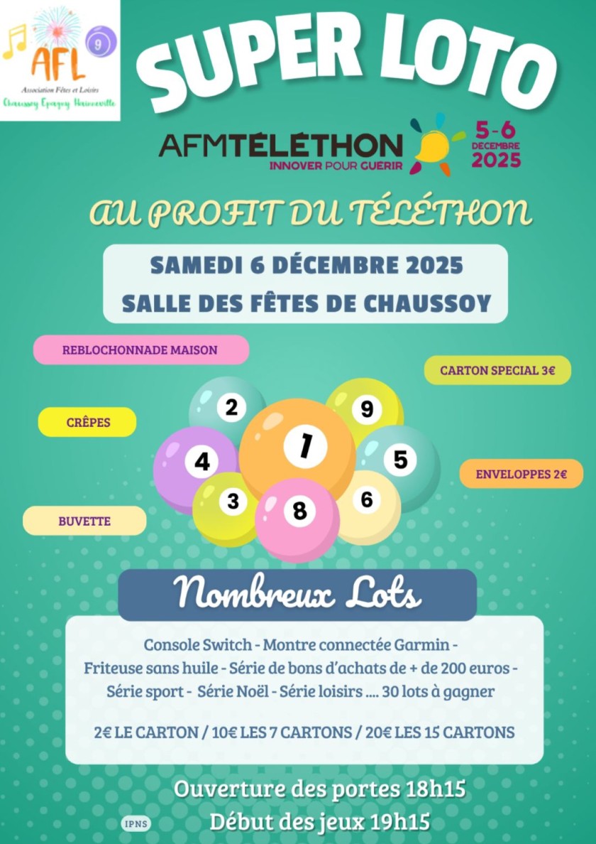 L'association Fêtes et Loisirs de Chaussoy Épagny organise un SUPER LOTO le samedi 6 décembre dans la salle des fêtes de Chaussoy Épagny nombreux lots ouverture des portes à 18h15 début des jeux à 19h15 reblochonnade maison crêpes buvette au profit de l'AFM TÉLÉTHON