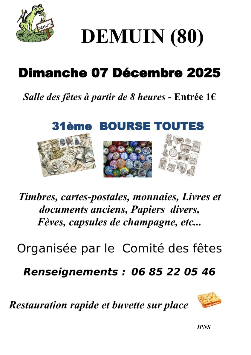 le comité des fêtes de Démuin organise la 31ème Bourse toutes collections le dimanche 07 décembre à partir de 8h dans la salle des fêtes de Démuin entrée 1€ restauration rapide et buvette sur place renseignements au 06 85 22 05 46 timbres, cartes-postales, monnaies, livres et documents anciens, papiers divers, fèves, capsules de champagnes […]