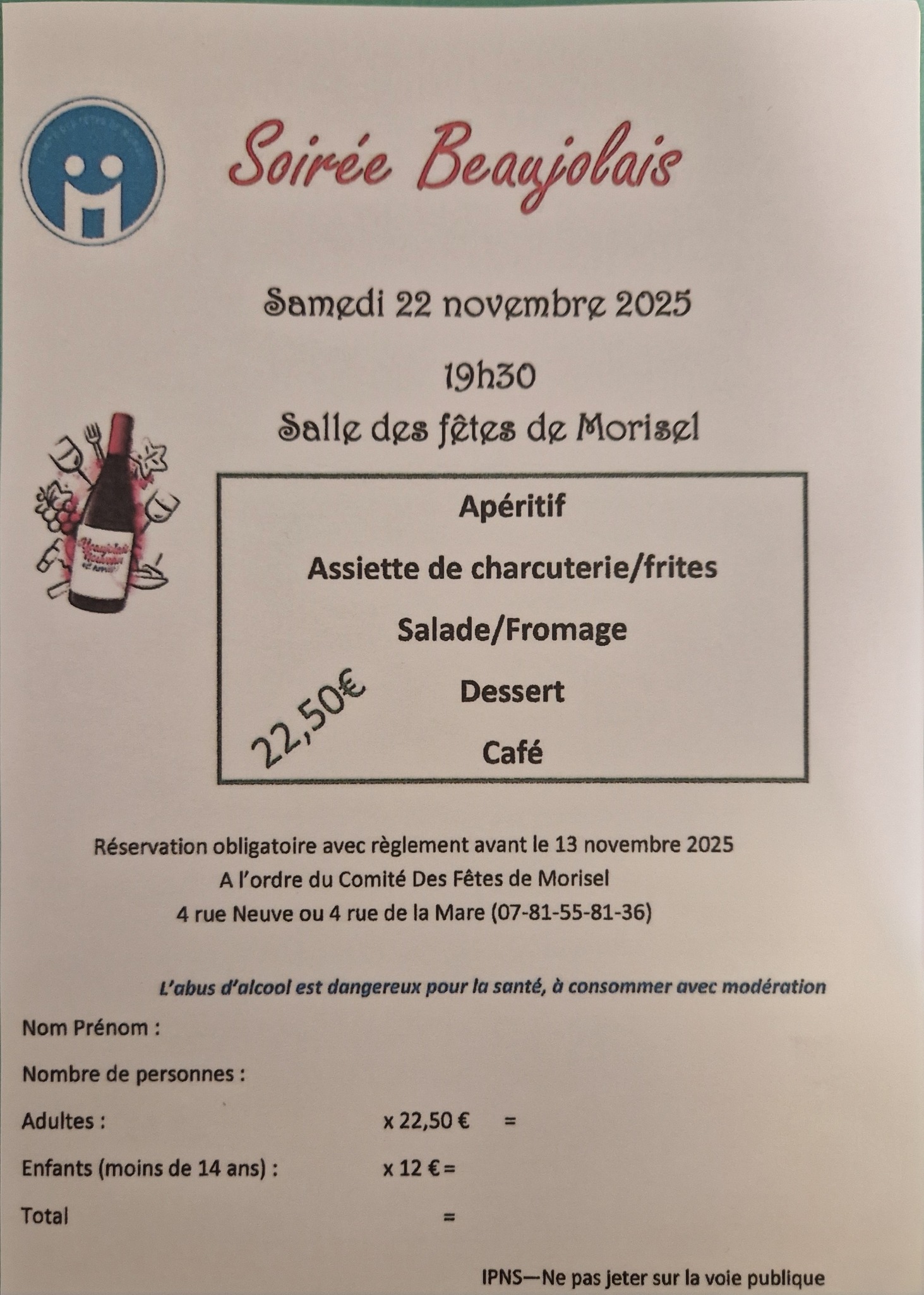Soirée Beaujolais le samedi 22 novembre à 19h30 dans la salle des fêtes de Morisel tarifs adultes 22.50€ et enfant - de 14 ans 12€ apéritif / assiette de charcuterie/frites / salade / fromage / dessert / café réservation obligatoire avec règlement avant le 13 novembre à l'ordre du comité des fêtes de Morisel 4 […]