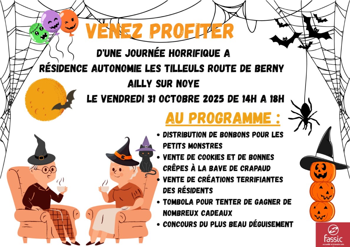 Venez profiter d'une après-midi horrifique à la résidence Les Tilleuls route de Berny à Ailly sur Noye le vendredi 31 octobre de 14h à 18h au programme : distribution de bonbons pour les petits monstres vente de cookies et de bonnes crêpes à la bave de crapaud vente de créations terrifiantes des résidents tombola pour […] ![]()